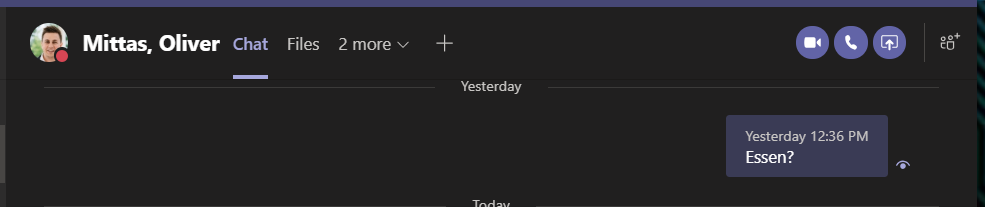 You can find the Team-Chat features also in the chat. Chats are possible with another person or a group of persons. To find your chat partner use the searching bar at the top of Microsoft Teams.