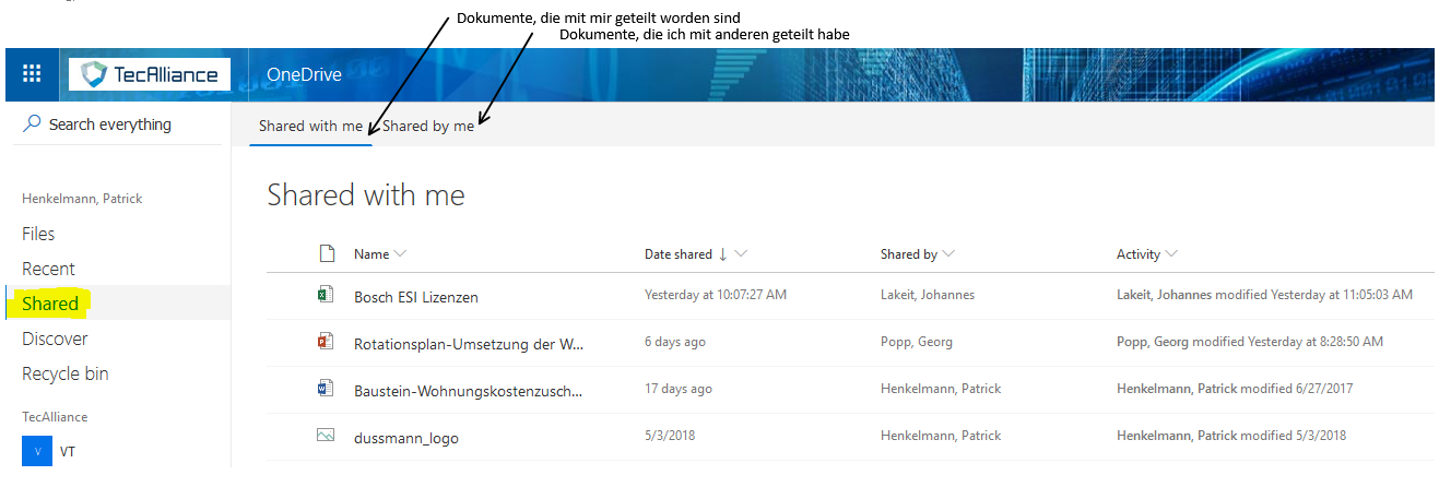 In OneDrive Online gibt es links im Menü "Shared". Darunter versteckt sich "Shared with me" und "Shared by me".