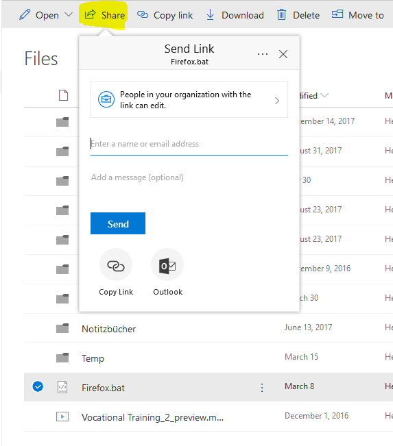 - Suche die gewählte Datei oder Ordner in OneDrive aus und wähle Share aus.