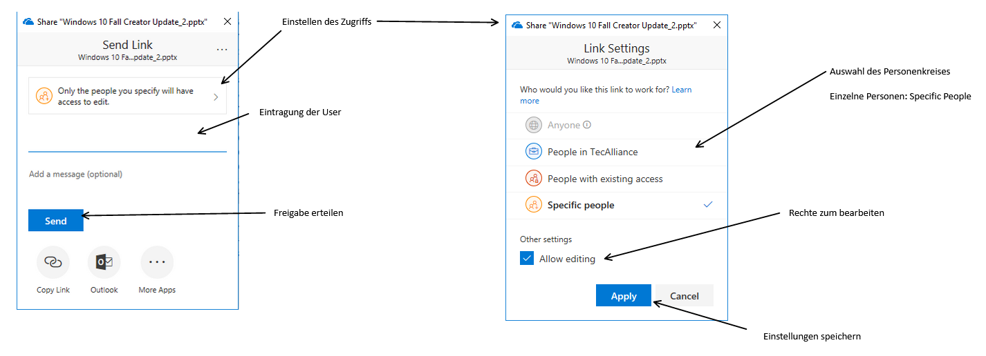- Das Sharefenster sieht bei allen Varianten identisch aus und ist auf die selbe Weise zu bedienen. Wählt den Zugriffsmodus und definiert die berechtigten Personen.