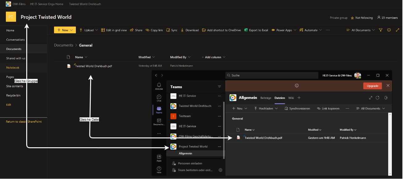 Dem SharePoint und Teams liegt eine Office365 Gruppe zugrunde. Jede Gruppe hat eine eigene SharePoint Seite, in der die Dateien ebgelegt werden können. Teams verweist auf die Dateien im SharePoint, kann sie öffnen und auch bearbeiten.