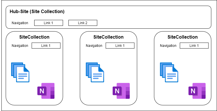 Für eine bessere Navigation im SharePoint gibt es Hub-Sites. Eine Hub-Site ist eine "besondere" Site Collection. Die Hub-Site hat die gleichen Inhalte und Funktionen zugrunde. Hub-Sites können auf ihre angehängten Site Collections zugreifen und deren Inhalt (sofern der aufrufende User Rechte auf die Site Collection hat) anzeigen.