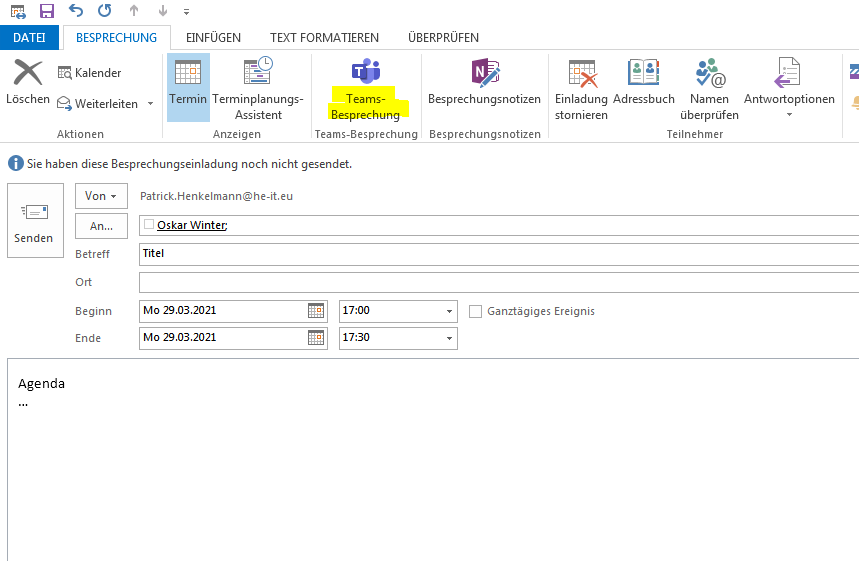 Über "Teams Besprechung" die Teams Einladung hinzufügen, Ort wird automatisch ausgefüllt. (Teams App erforderlich mit Cooperate Account erforderlich)