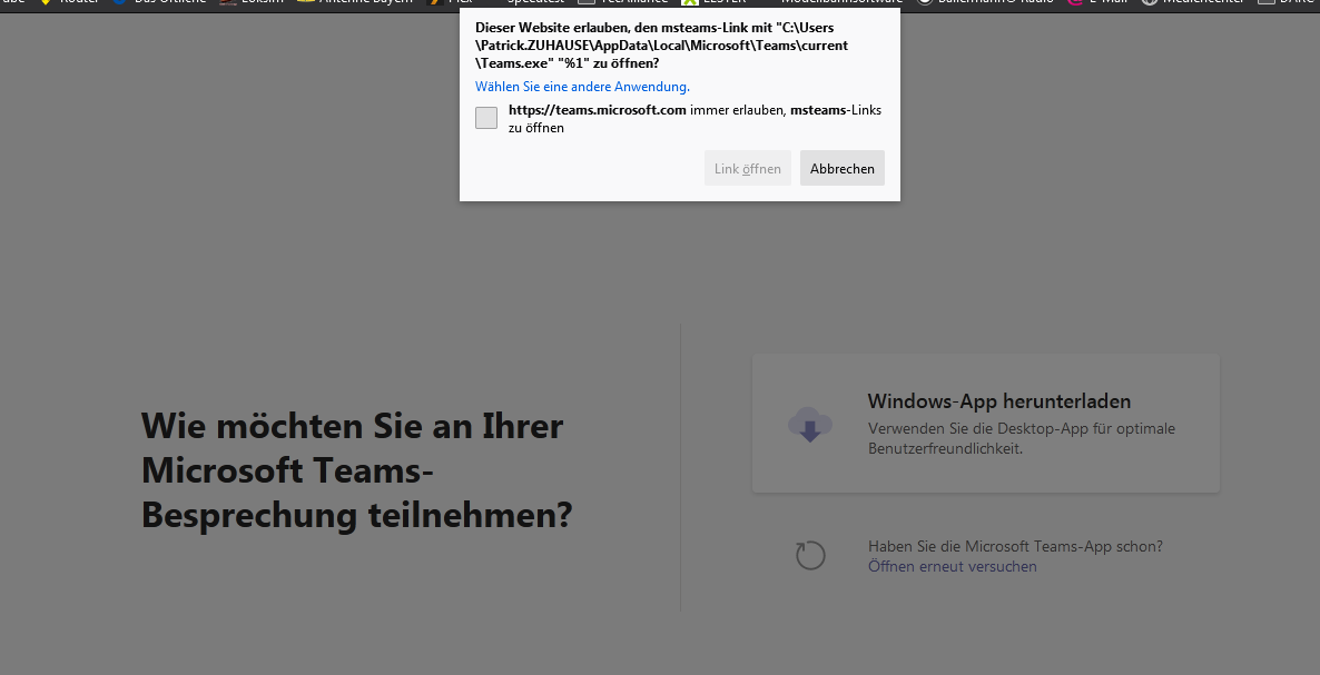 Den Link mit einer Anwendung öffen: Microsoft Teams, wenn es nicht installiert ist, Windows App herunterladen. (Sollte der Hinweis nicht kommen, kann es mit "Öffnen erneut versuchen" nochmals versucht werden)